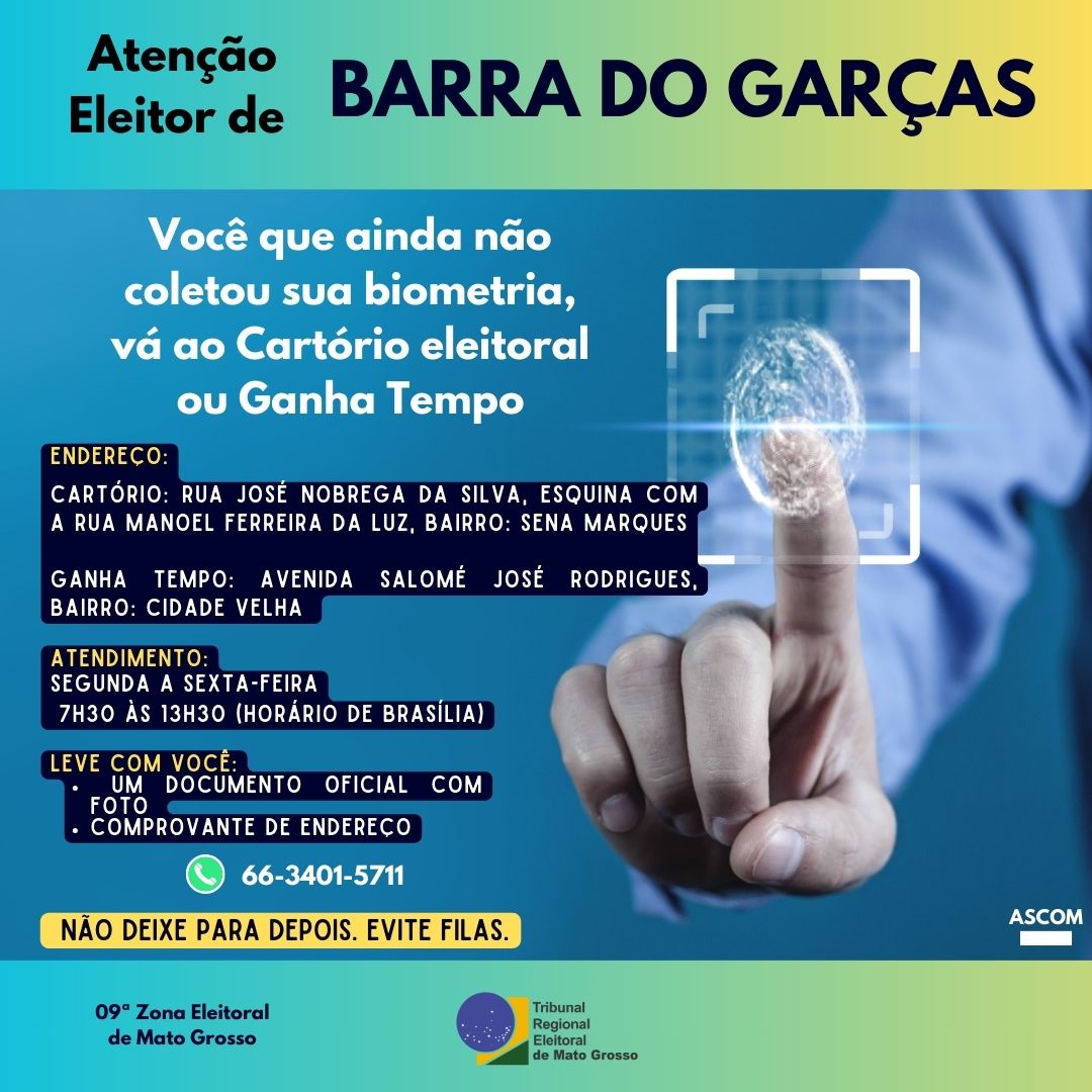 O Cartório Eleitoral de Barra do Garças está realizando a coleta de biometria e regularização dos títulos eleitorais, ambos os processos são de extrema importância para que o eleitor possa votar sem problemas e também podem ser feitos no Ganha Tempo de Barra do Garças.