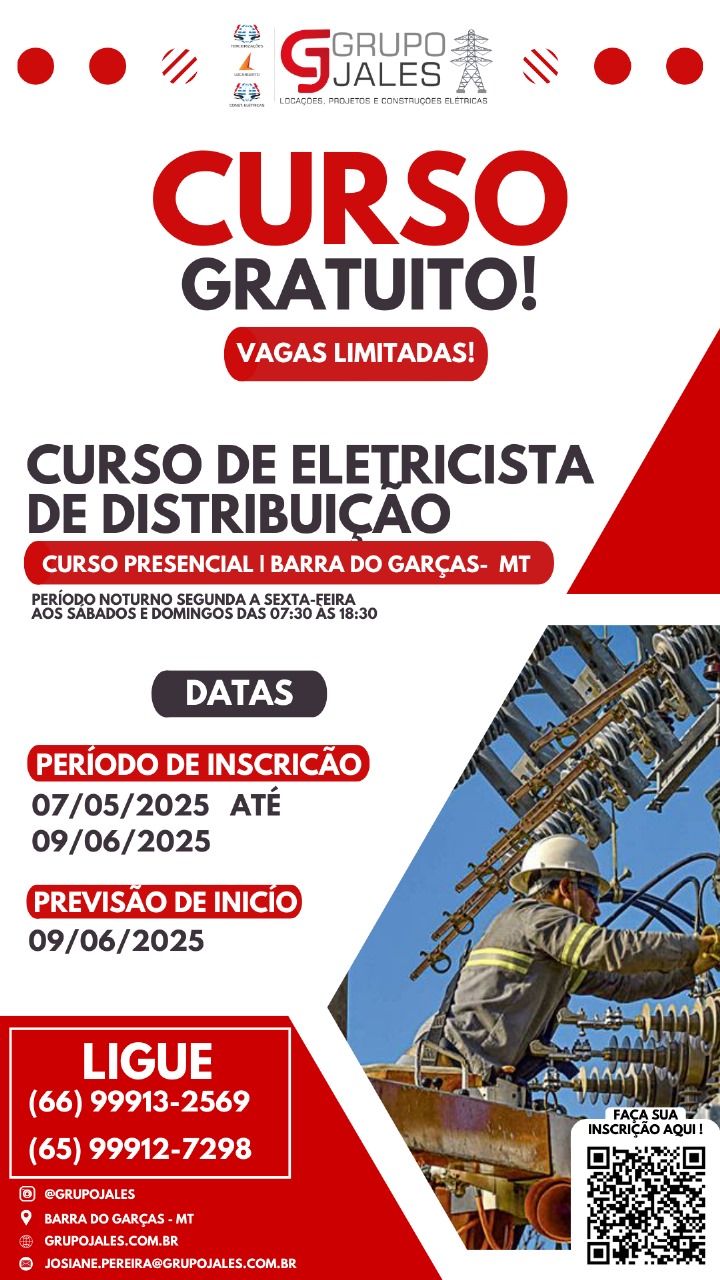 O Grupo Jales, especialista no ramo de locações, projetos e construções elétricas, está com inscrições abertas para o curso gratuito de Eletricista de Distribuição, em Barra do Garças. As vagas são limitadas e as inscrições vão até o dia 9 de junho.