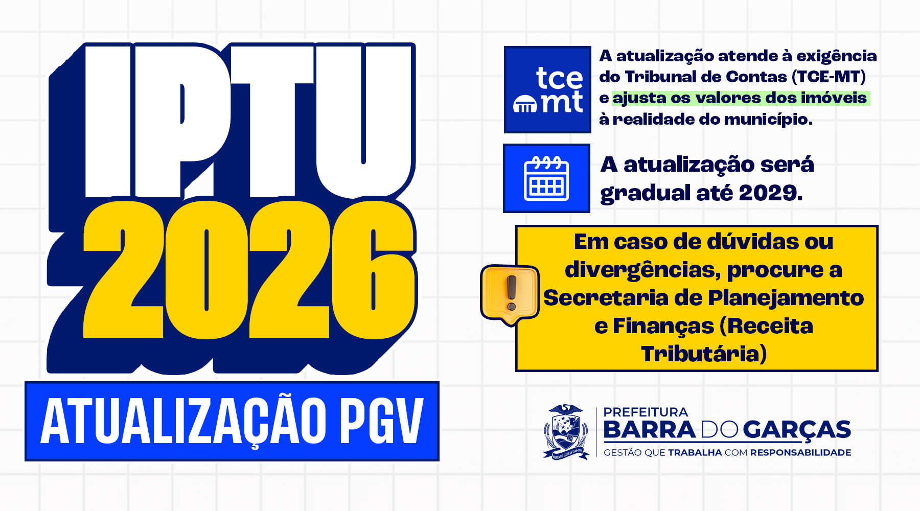 Neste ano, a Prefeitura de Barra do Garças colocou em vigor a nova Planta Genérica de Valores (PGV) do município. A medida atende às orientações do Tribunal de Contas do Estado de Mato Grosso e tem como objetivo adequar, de forma gradual e responsável, os valores à realidade atual do município, evitando impactos abruptos à população.