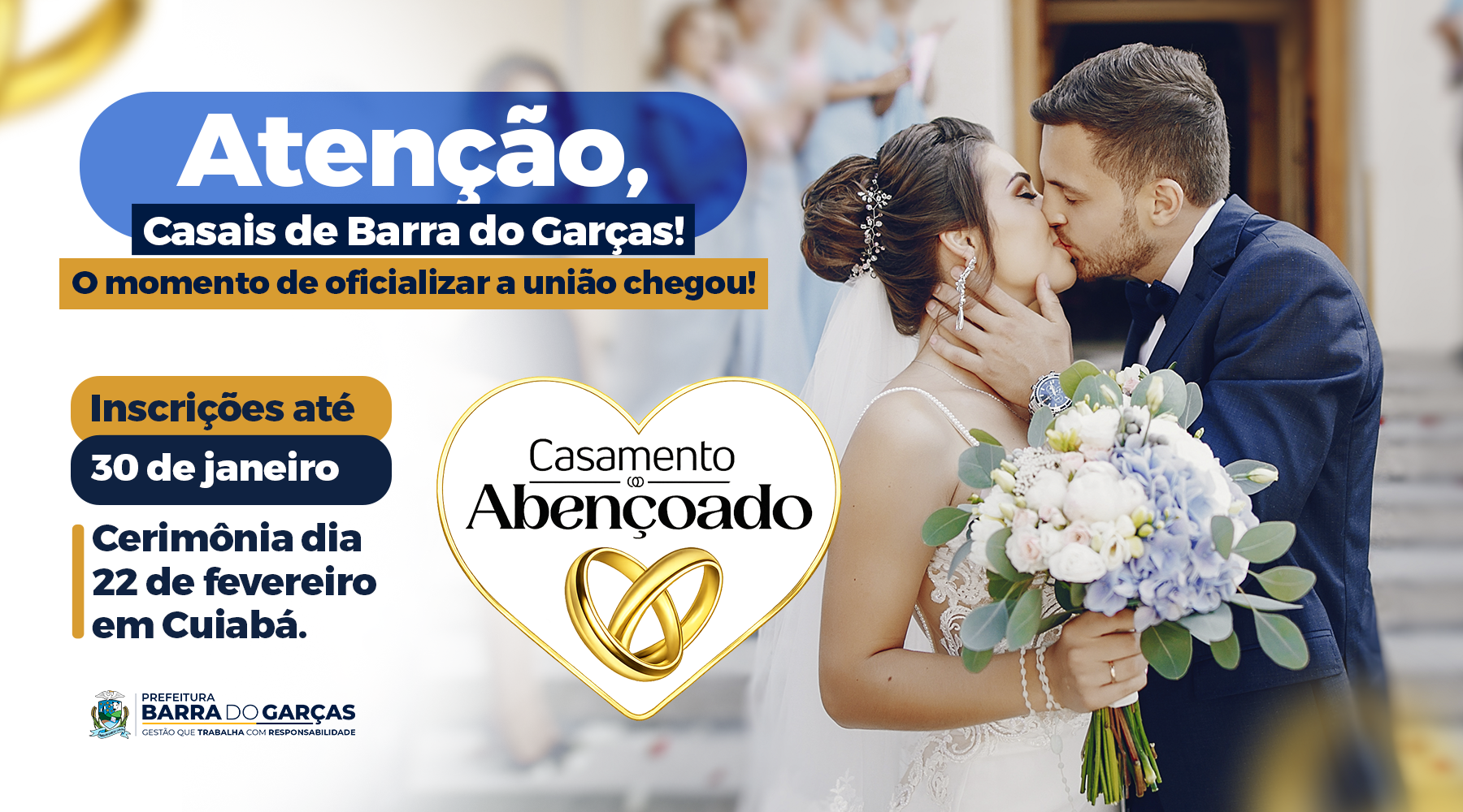 Casais de Barra do Garças interessados em oficializar a união civil de forma gratuita têm até o dia 30 de janeiro para se inscreverem no programa "Casamento Abençoado". A iniciativa, promovida pelo Governo do Estado de Mato Grosso, por meio das ações da Primeira-Dama Virgínia Mendes, garante aos participantes uma cerimônia completa e totalmente custeada. A celebração será realizada na capital do estado, Cuiabá, no dia 22 de fevereiro, reunindo casais de diversos municípios.
