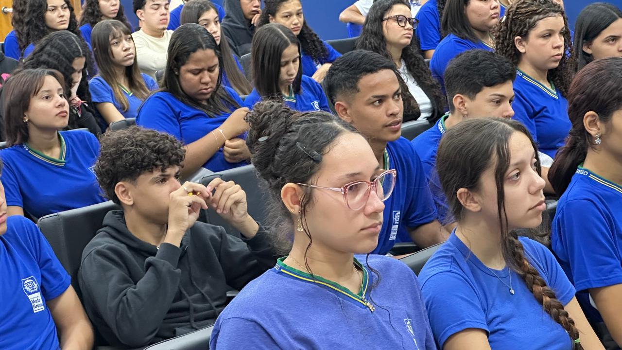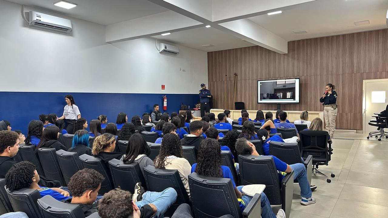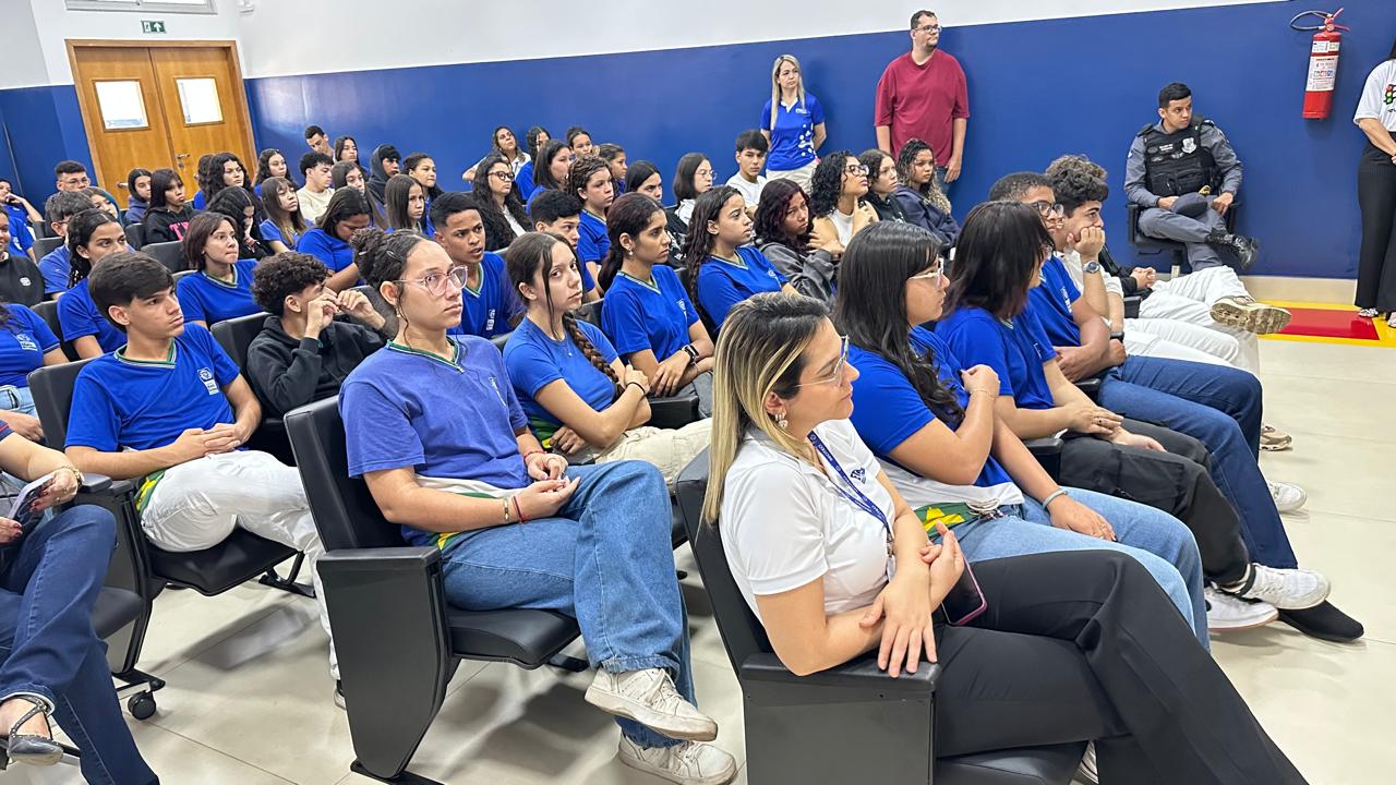 Nesta manhã, estudantes acompanharam uma palestra educativa sobre segurança no trânsito, com a agente da Polícia Rodoviária Federal, Letícia Alves, e com o agente de Serviço de Trânsito do Detran, Jhonattan Barbosa.