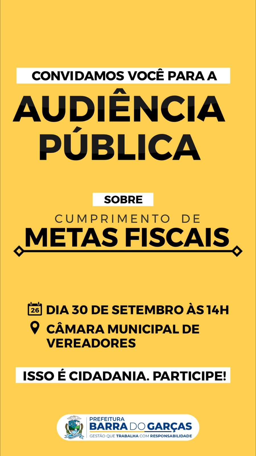 A Prefeitura Municipal de Barra do Garças, através da Secretaria Municipal de Planejamento do Município de Barra do Garças – MT, CONVIDA a população barra-garcense para participarem da AUDIÊNCIA PÚBLICA que será realizada na CÂMARA de vereadores dia 30 de setembro de 2022, as 14:00, horário de Brasília, serao avaliadas as Metas Fiscais do 2º quadrimestre de 2022 do Municipio de Barra do Garças-MT.