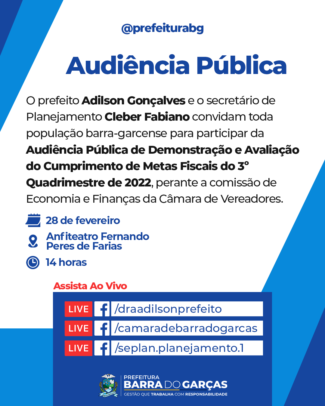 O prefeito de Barra do Garças, Dr. Adilson Gonçalves e o secretário de Planejamento, Cléber Fabiano, convidam toda a população para participar da Audiência Pública de Demonstração e Avaliação do Cumprimento de Metas Fiscais, referente ao 3° Quadrimestre de 2022, perante a Comissão de Economia e Finanças da Câmara de Vereadores, que acontecerá no dia 28 de fevereiro, a partir das 14 horas.